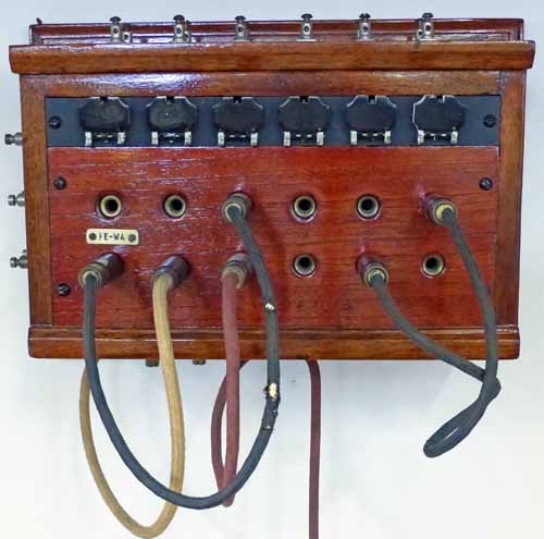 A very early magneto switchboard having one trunk or junction circuit and a maximum of five subscribers. Line connections were made on the top. Cross-connections were made with 2 wire double ended cords.